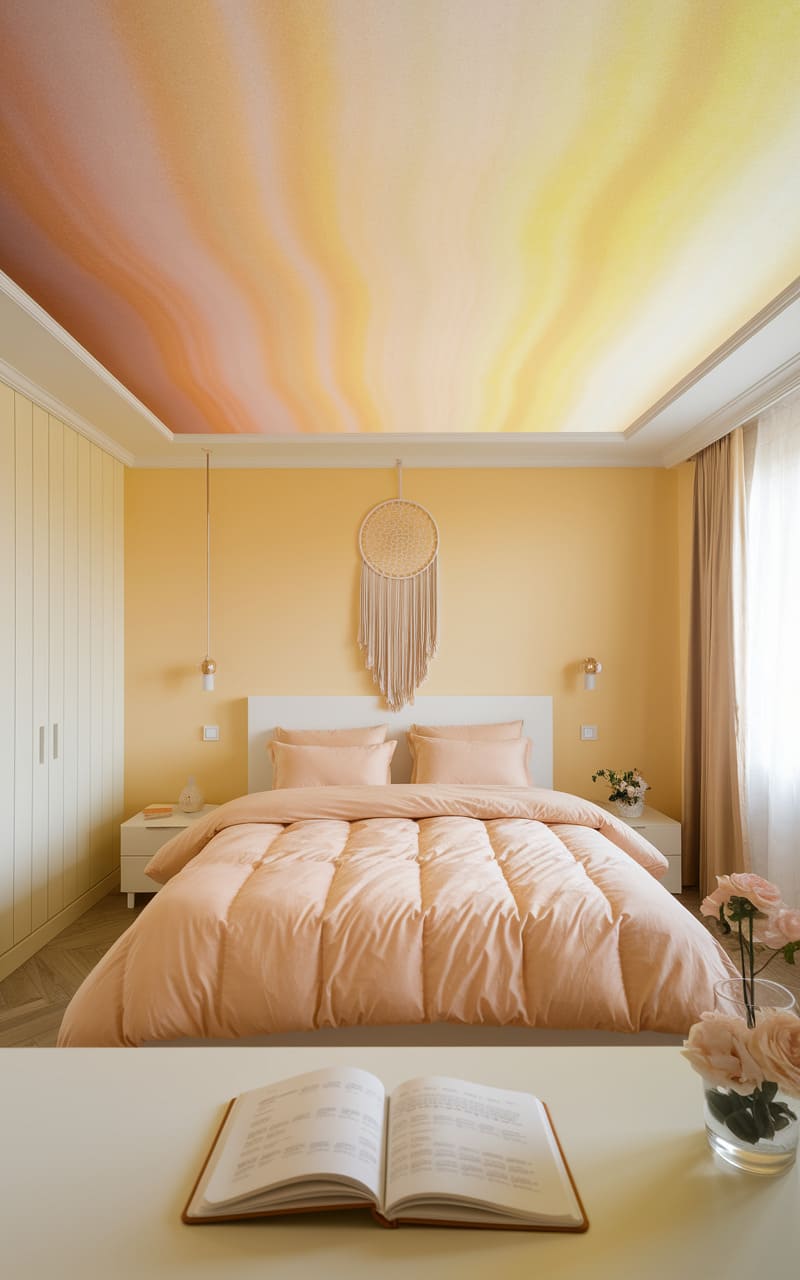 110. Warm Peach and Light Wood Dreamcore Bedroom with Subtle Japandi Influence