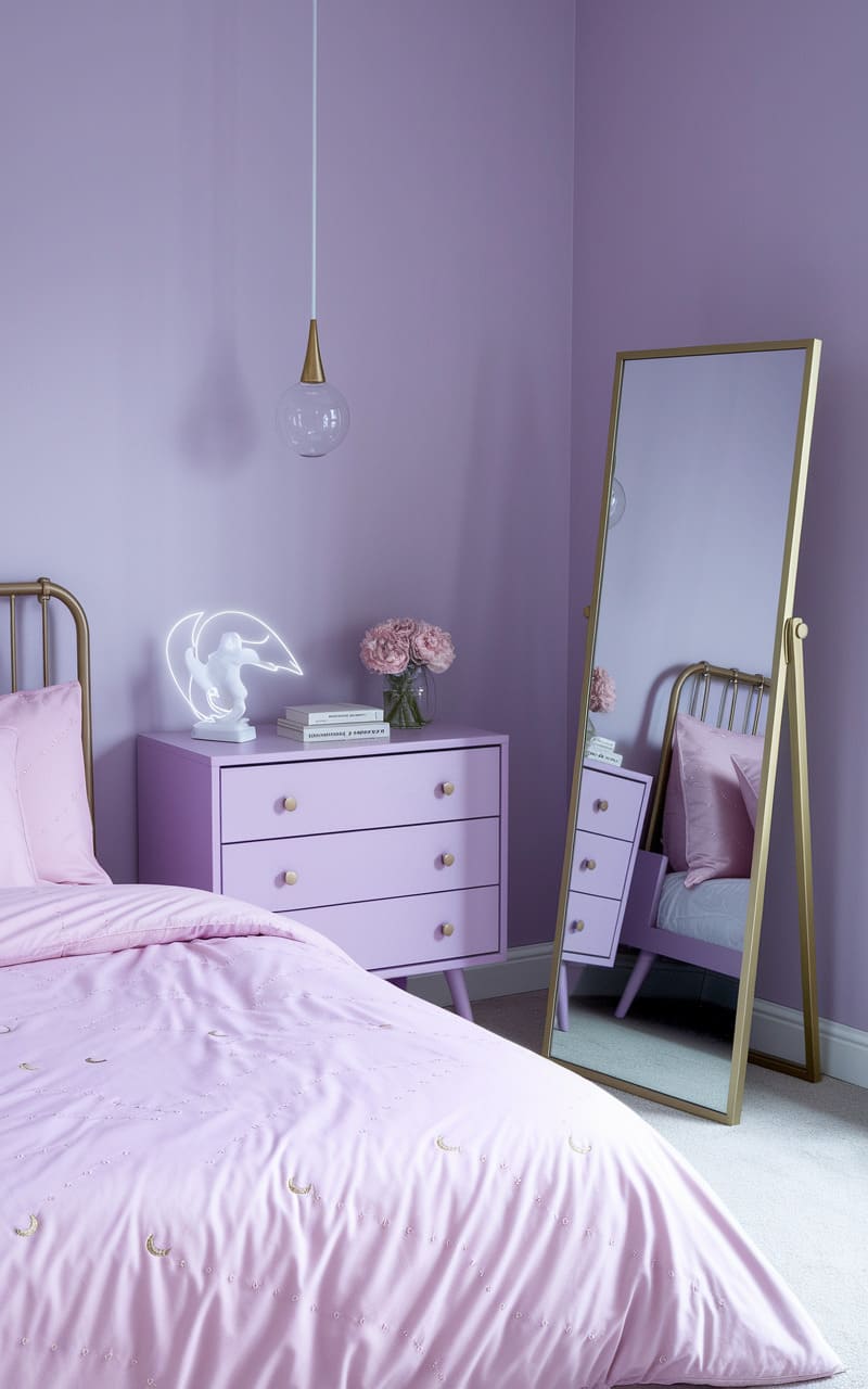 A lavender dreamscape unfolds, where walls bleed into a plush bedframe and curtains ripple like soft amethyst clouds. Antique portraits, each a portal to a whispered story, hang askew, their gilded frames mirroring the vanity’s polished surface. A solitary lamp casts a gentle glow, illuminating a tufted stool that seems to float, a silent invitation to step into this pastel reverie where time is a gentle, lavender-scented sigh.