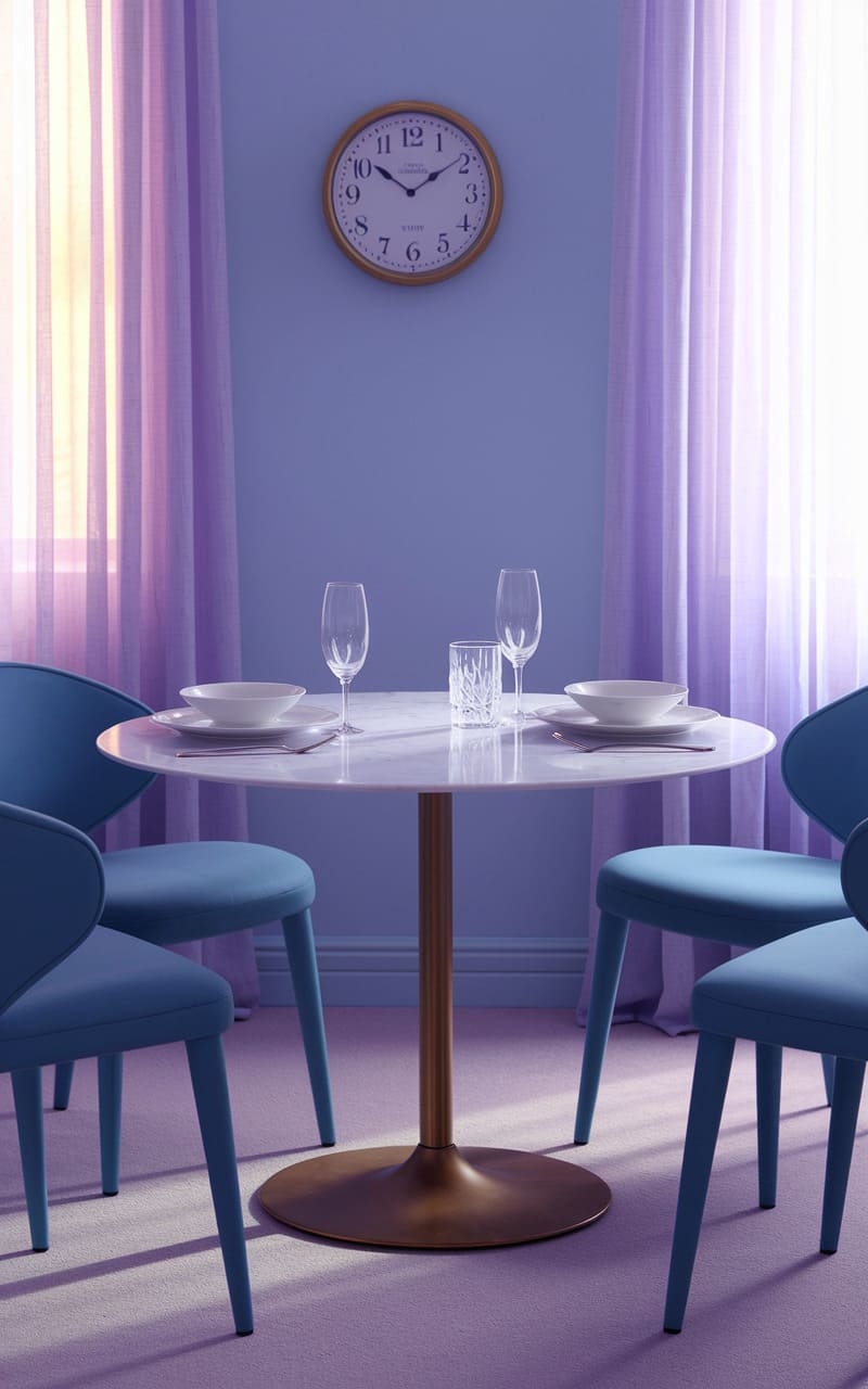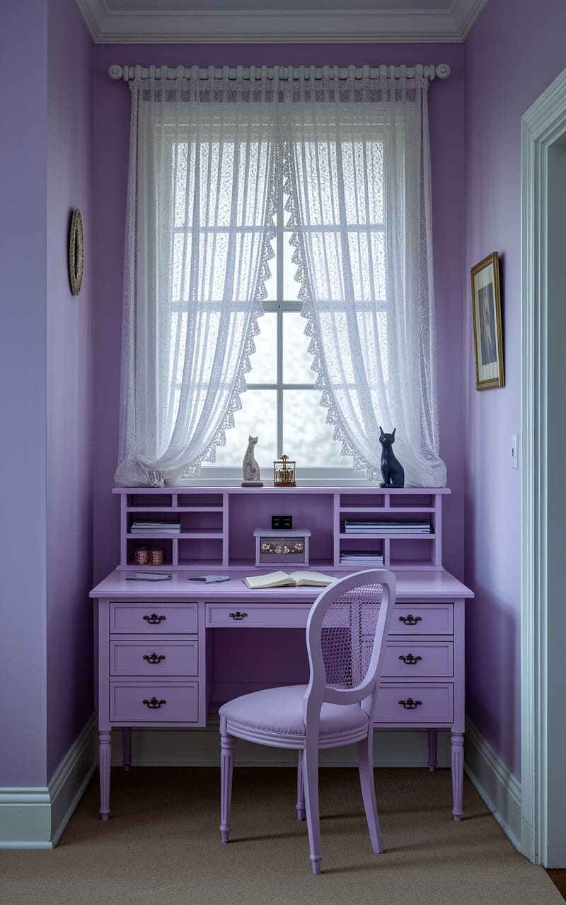 The room shimmered in a lavender haze, a monochromatic dream where even the air seemed to have absorbed the soft, floral hue. A delicate lace curtain, like a frozen waterfall, framed a window that offered no view, only a diffuse, otherworldly light. A perfectly organized desk, its drawers whispering secrets in their neat rows, waited patiently for a hand that would never arrive, the stillness punctuated only by the silent sentinels of two porcelain cats, their glassy eyes reflecting the room’s uncanny, tranquil vacancy.