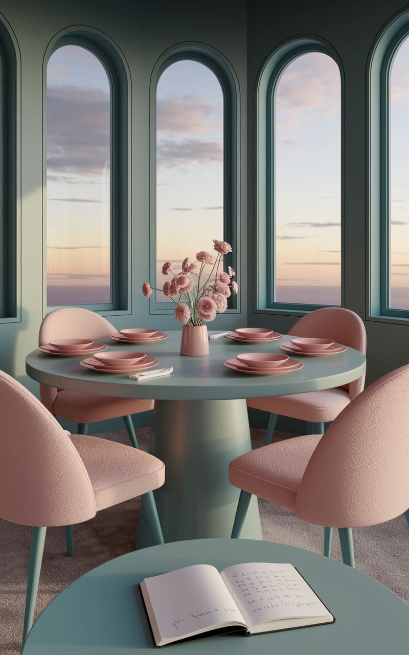 In a realm where pastel hues reign, this kitchen defies logic with its mismatched cabinets and salmon-toned walls, yet exudes a peculiar harmony. A bulbous pendant light hangs like a suspended moon, casting a soft glow on the round table where a lone vase holds skeletal branches, their bareness a stark contrast to the saccharine sweetness of the space. The room feels both familiar and unsettling, as if a child’s drawing has come to life, slightly warped and delightfully off-kilter.