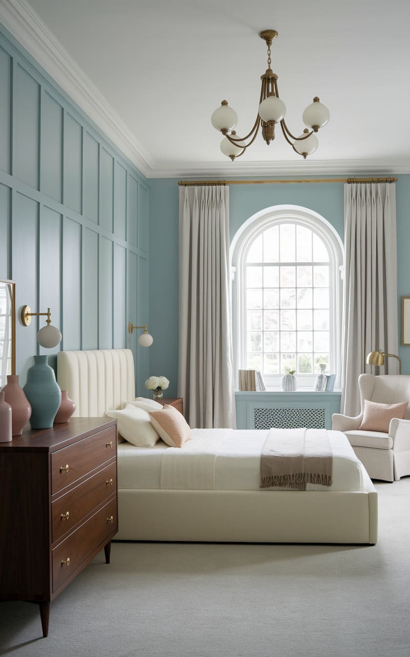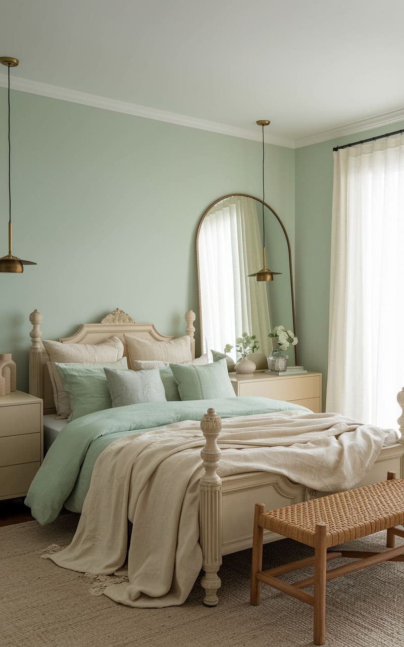 103. Mint Green and Beige Dreamcore Bedroom with a Vintage Dresser and Arched Mirror