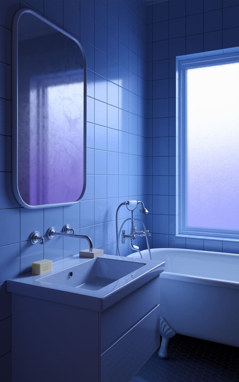 The bathroom pulsed with an electric blue chill, a liminal space where the ordinary act of bathing warped into something unsettlingly serene. A mirror, reflecting a lavender ghost, hung askew, hinting at a reality just slightly out of sync. The porcelain gleamed, cold and smooth, under the stark, almost surgical light, while the frosted window offered a glimpse of a world bleached white, a silent promise of an escape or a deeper descent into this meticulously sterile, strangely comforting void.