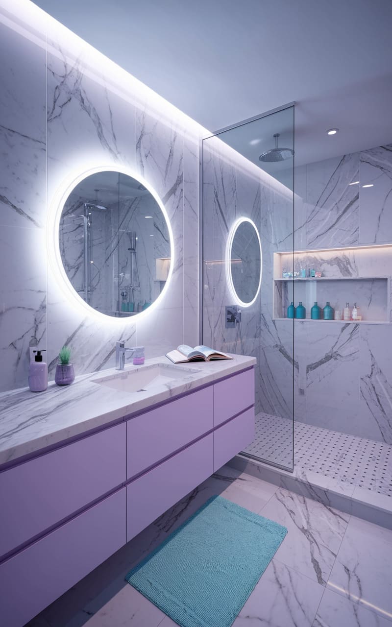 This bathroom hums with a neon-tinged silence, a liminal space where the cool, swirling marble walls seem to stretch into infinity. The glowing ring mirrors, like portals to another dimension, reflect a subtly distorted reality, while the lavender vanity and the lone, almost shockingly blue rug anchor the space in a surreal, yet strangely calming, palette. It’s a place where the mundane act of washing your hands feels like stepping into a digital dream, a glitch in the everyday where the familiar becomes unsettlingly beautiful.