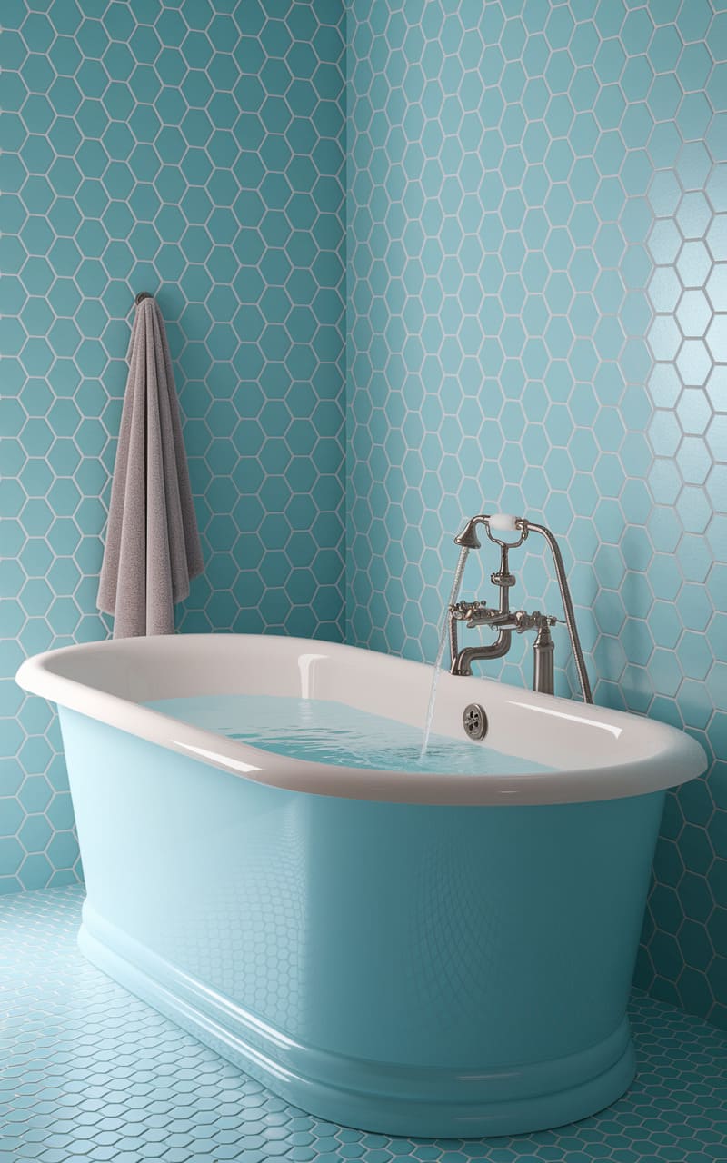 The bathroom hums with a watery silence, a pastel dreamscape where hexagonal tiles stretch into infinity, blurring the lines between wall and floor. A clawfoot tub, filled to the brim with impossibly still water, reflects the cool, ethereal light, its chrome faucet a glinting, alien eye. A lone towel hangs limply, a forgotten afterthought in this meticulously crafted, yet somehow unsettling, space where the familiar act of bathing feels strangely detached, like a memory half-submerged.