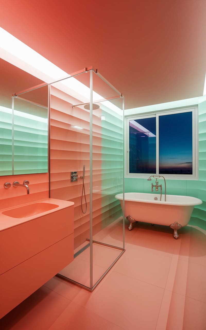 The bathroom pulsed with an unsettling, synthetic warmth, a liminal space where the familiar act of bathing warped into something otherworldly. A clawfoot tub, gleaming and pristine, sat bathed in the eerie glow of a sunset filtered through textured, almost liquid walls, their gradient shifting from a sickly sweet peach to a cool, minty green. A stark glass shower stall stood sentinel, its chrome fixtures reflecting the unsettling hues, while a window offered a glimpse of a twilight sky that felt both impossibly close and infinitely distant, a disorienting blend of comfort and uncanny unease.