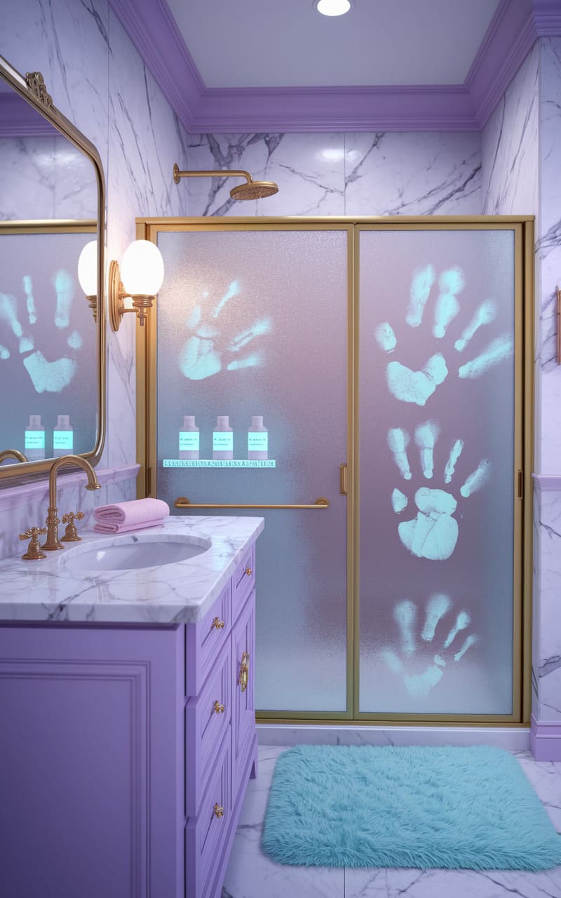 The bathroom shimmers in lavender and marble, a saccharine dreamscape curdled by the ghostly imprints of hands pressed against the frosted shower glass. Golden fixtures gleam with an unsettling warmth, casting a soft glow that highlights the unnerving repetition of handprints, each a silent scream in a space that should be serene. The fluffy rug, a splash of turquoise, offers a fleeting comfort, a fragile anchor in a room where the familiar turns unsettlingly surreal.