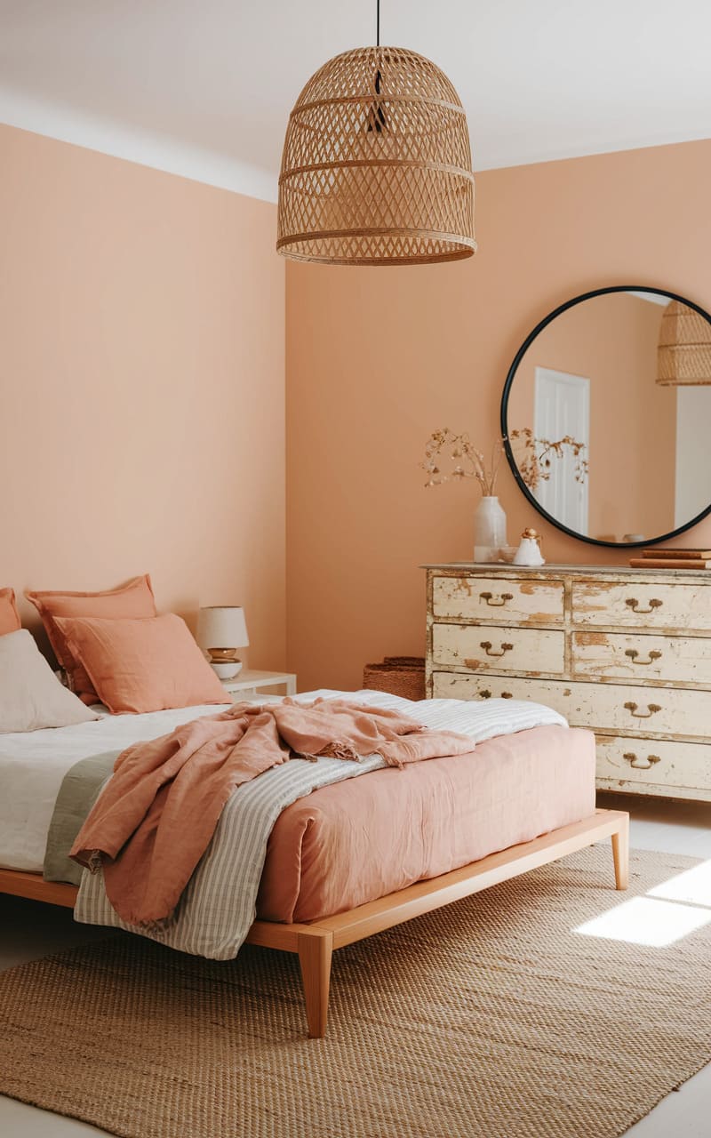 Sun-warmed peach tones bathe this room in an eternal late afternoon glow, the soft hues clinging to the rumpled linen and distressed dresser like a memory of a summer’s day fading into a dream. A woven pendant lamp casts delicate shadows, hinting at secrets whispered in the quiet space, while the perfectly circular mirror reflects a distorted slice of reality, a portal to a place where time bends and the familiar feels strangely distant, a comforting yet unsettling warmth enveloping everything.