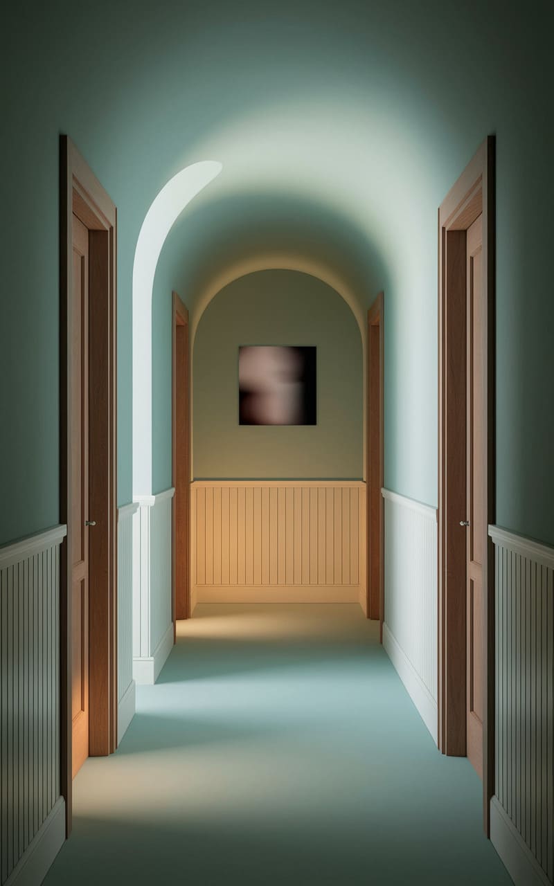 An echoing hallway stretches into a mint-tinged twilight, its arched ceiling a ghostly echo of a forgotten cathedral, while two open doorways stand like silent sentinels, their warm wood a stark contrast to the cool, spectral light filtering from an unseen source. A blurred, indistinct image hangs at the corridor’s end, a whispered secret in the liminal space, where the familiar architecture of home twists into something unsettlingly serene, a place where reality softens and the subconscious takes hold.