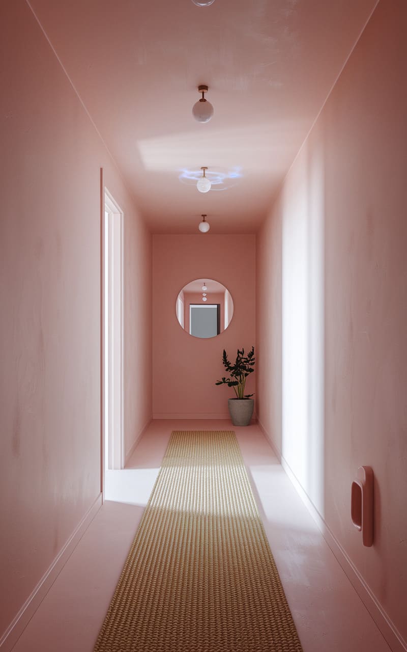 112. Blush Pink Dreamcore Hallway with a Runner Rug That Never Ends
