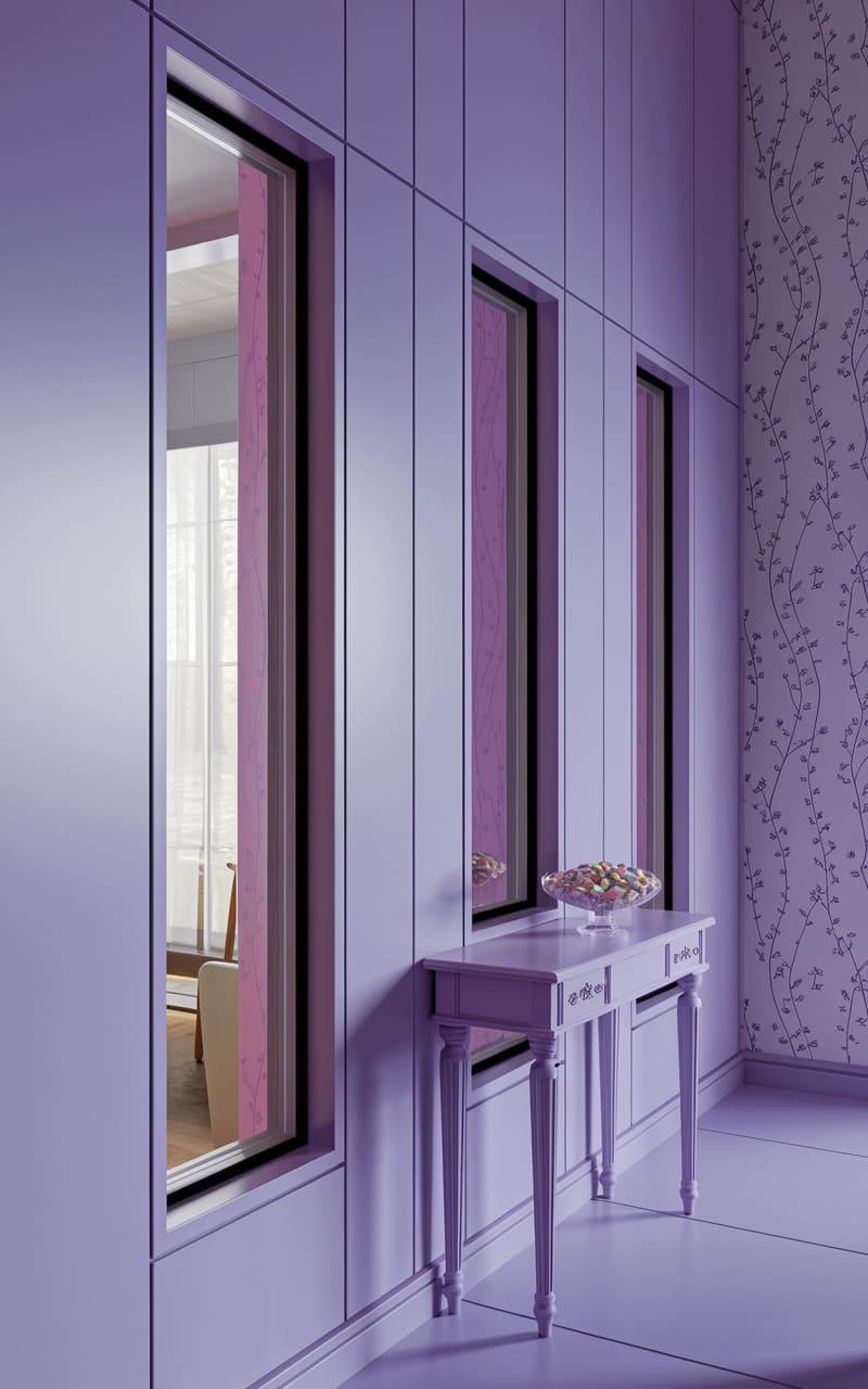 The hallway stretches, a lavender-washed passage into a twilight realm, where recessed lights cast an eerie glow on the textured walls. A tall, grandfather clock stands sentinel, its dark wood a stark, grounding presence against the ethereal palette. At the hallway’s end, a window frames a misty, indistinct landscape, a portal to a world just beyond reach, while a small, inviting bench nestled beneath suggests a pause in this liminal space, a moment of quiet contemplation in the heart of a waking dream.