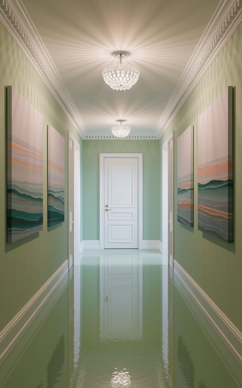 This hallway stretches into infinity, a mint-green corridor where the floor reflects like a still, shallow pool, distorting the framed landscapes that seem to bleed into the walls. Crystal chandeliers cast a fractured light, turning the ornate crown molding into a serrated edge against the soft glow, and the perfectly centered white door at the end feels less like an exit and more like a point of no return, a silent invitation into a liminal space where perspective bends and time loses all meaning.
