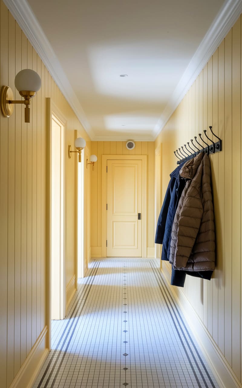 A buttery yellow hallway stretched into infinity, its receding perspective a dizzying dance of lines and light, punctuated by the ghostly repetition of doors and sconces. The tiled floor, a grid of cool order, offered a stark contrast to the warm, enveloping walls, while a row of jackets hung in a silent, expectant pause, suggesting a journey about to begin or a departure already made. It was a liminal space, a pause between places, where the familiar geometry of home warped into something subtly unsettling, a dream whispered in the language of hallways.