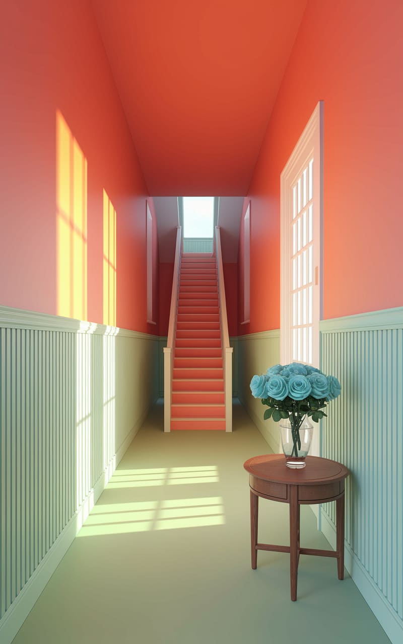The hallway stretched like a sun-warmed memory, a coral-hued passage leading to a staircase bathed in ethereal light, a promise of ascension or escape. Mint-green wainscoting anchored the dream, while a bouquet of impossibly blue roses sat perched on a simple table, a surreal counterpoint to the linear, almost clinical perfection of the space. It was a liminal corridor, a place where the familiar geometry of architecture bent into something softly unsettling, a whisper of a dream just beyond the reach of waking logic.