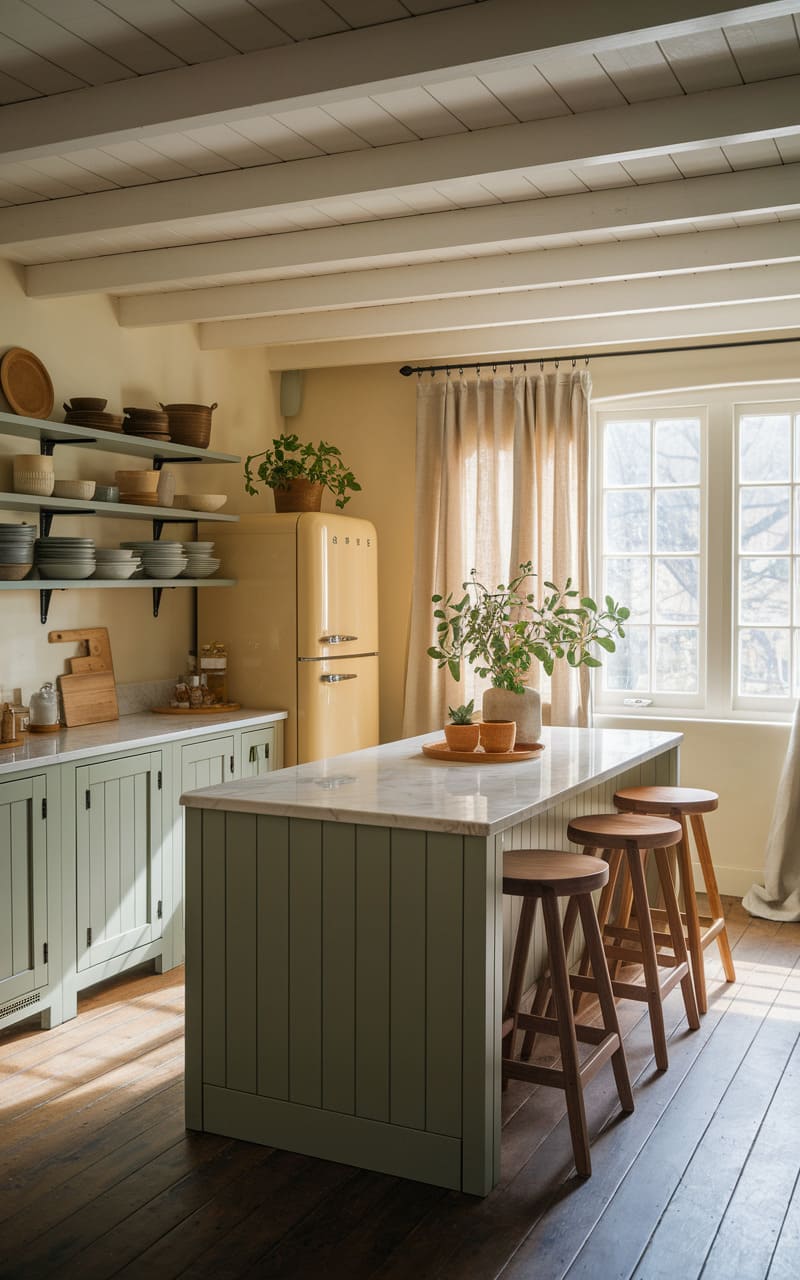 121. Muted Sage and Warm White Dreamcore Kitchen with a Mix of Modern and Rustic Elements