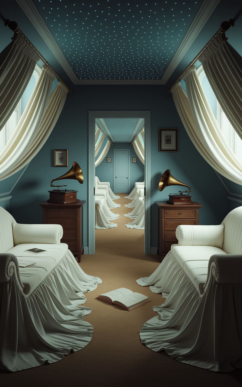 The room stretches into infinity, a mirrored hallway lined with endless, draped sofas and gramophones playing a silent tune, while a single, open book lies abandoned on the carpet, its pages whispering of forgotten stories. The walls, a cool, muted blue, are punctuated by a ceiling sprinkled with star-like pinpricks, suggesting a night sky trapped indoors. It’s a space that feels both grand and claustrophobic, a labyrinth of repetition where time loops and reality folds in on itself, leaving you adrift in a serene, yet unsettling, echo of familiarity.