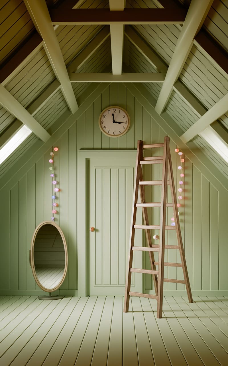 The attic room pulsed with a hushed, mint-green tranquility, a secret hideaway where time seemed to slow, measured by the languid tick of an oversized clock. A ladder leaned invitingly, a portal to some unseen upper realm, while a string of fairy lights dripped like frozen starlight, casting a soft glow across the sloped ceiling and the oval mirror that reflected not a person, but a sense of wistful solitude. It was a space built for whispers and daydreams, a quiet rebellion against the sharp edges of reality.