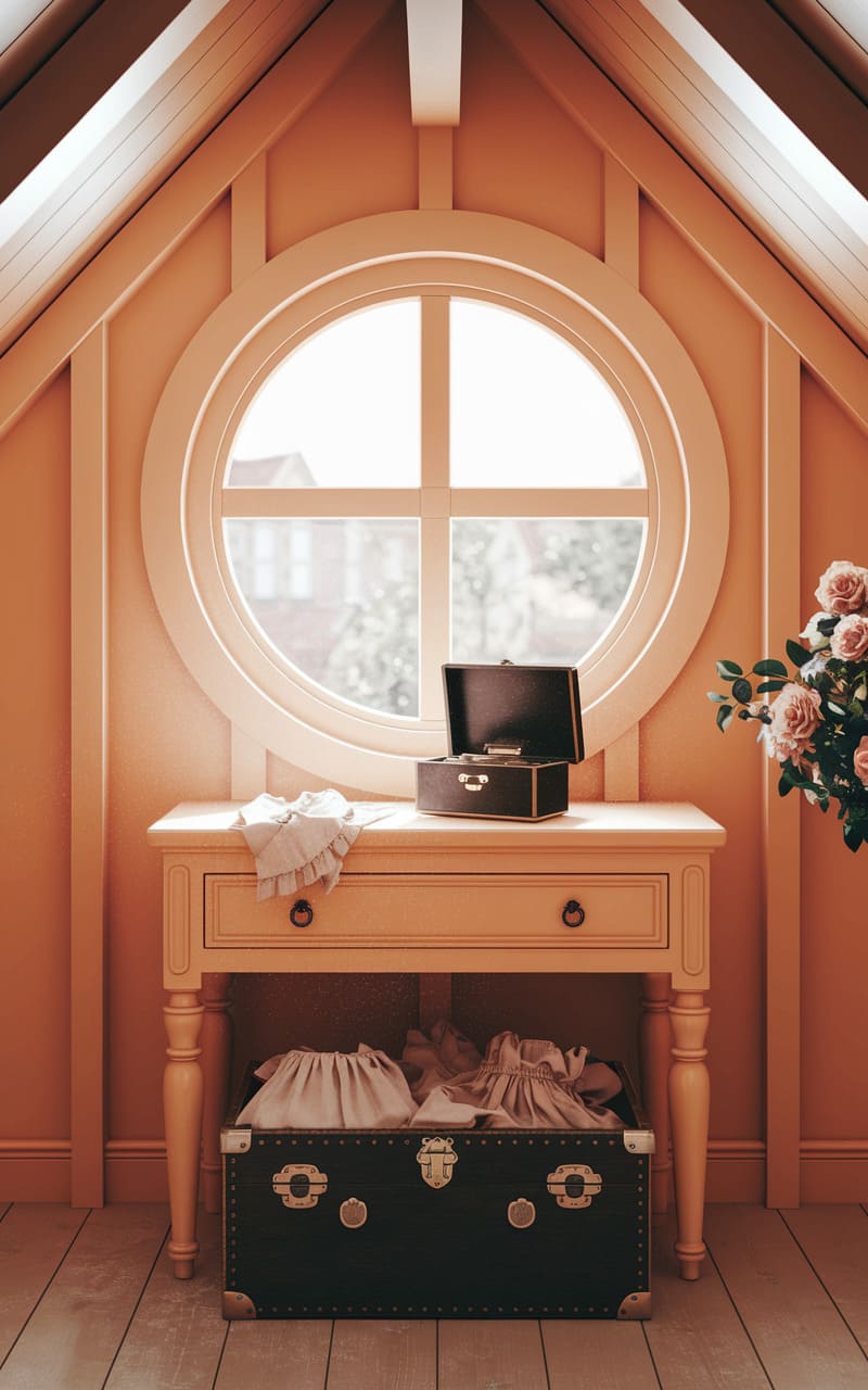 Nestled within the warm embrace of an attic, a round window frames a hazy world beyond, while a stage-like arrangement of a small table and open trunks hints at a story left unfinished. The soft, peachy tones of the walls and the delicate fabric spilling from the drawers create a sense of gentle nostalgia, as if this space exists in the amber glow of a forgotten afternoon, where memories are stored in cedar-lined chests and time bends around the curve of a window.