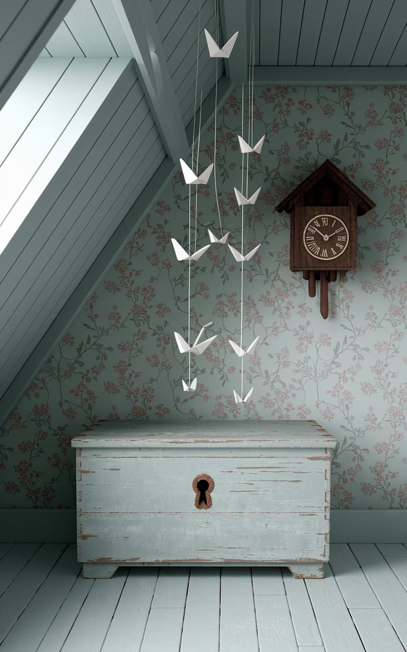The attic room held its breath, a flock of paper birds frozen mid-flight, suspended by unseen threads above a weathered chest that whispered of forgotten secrets. A cuckoo clock, its wooden face a silent judge, hung on wallpaper patterned with faded blooms, the entire scene bathed in a cool, unsettling light. It felt like a moment trapped between waking and dreaming, a space where time had folded in on itself and the ordinary had taken on a strange, unsettling significance.