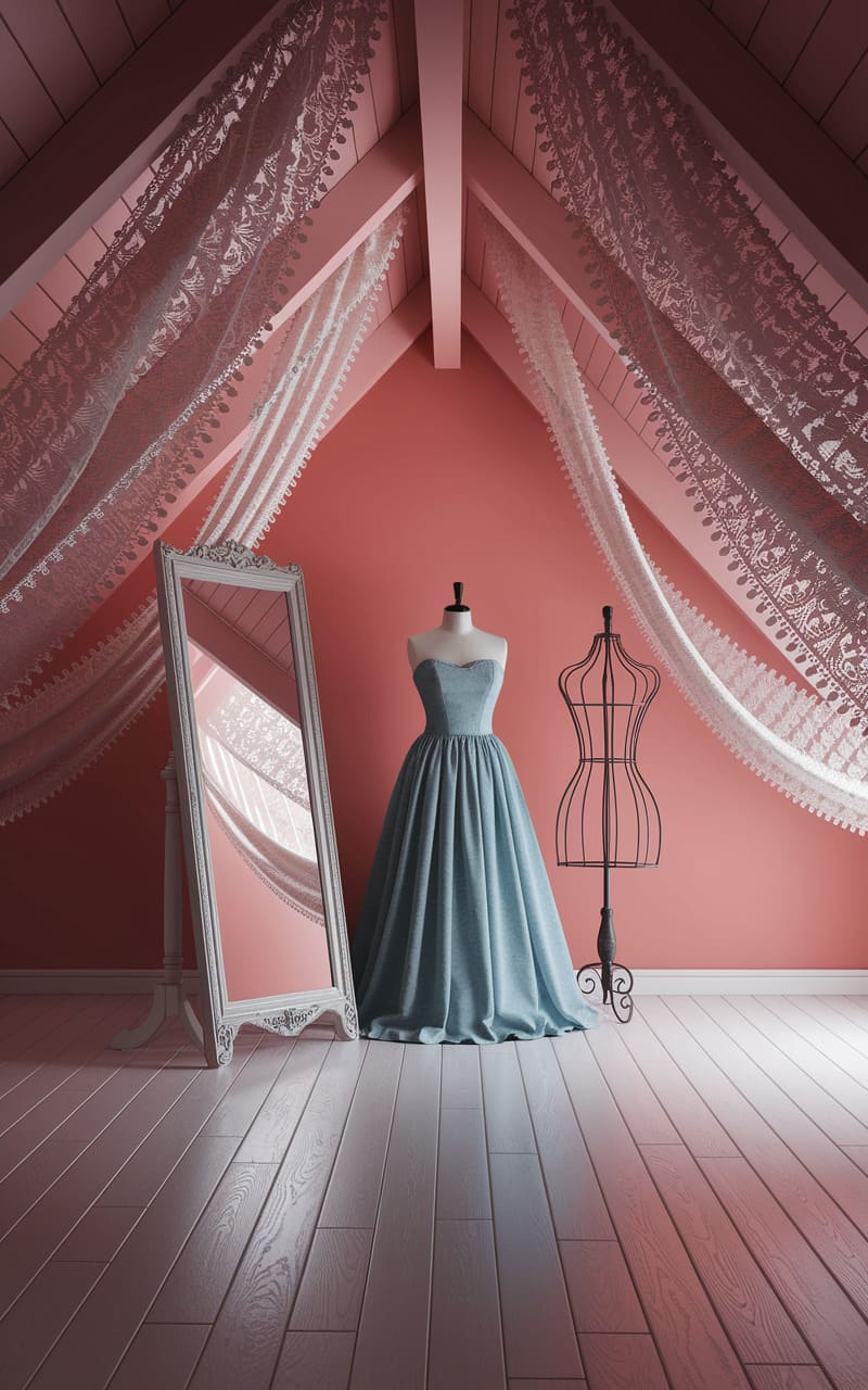 The attic was a hushed sanctuary of faded rose and whispered secrets, where a dressmaker’s dummy stood draped in a twilight-blue gown, its fabric catching the ethereal light filtering through lace-draped beams. A leaning mirror, reflecting not a person but a phantom of the room itself, added to the sense of a memory half-forgotten, a space where time had slipped its moorings and dreams hung suspended in the dust-moted air like forgotten tapestries. It was a room where imagination took flight, a stage set for a play that existed only in the quiet corners of the mind.