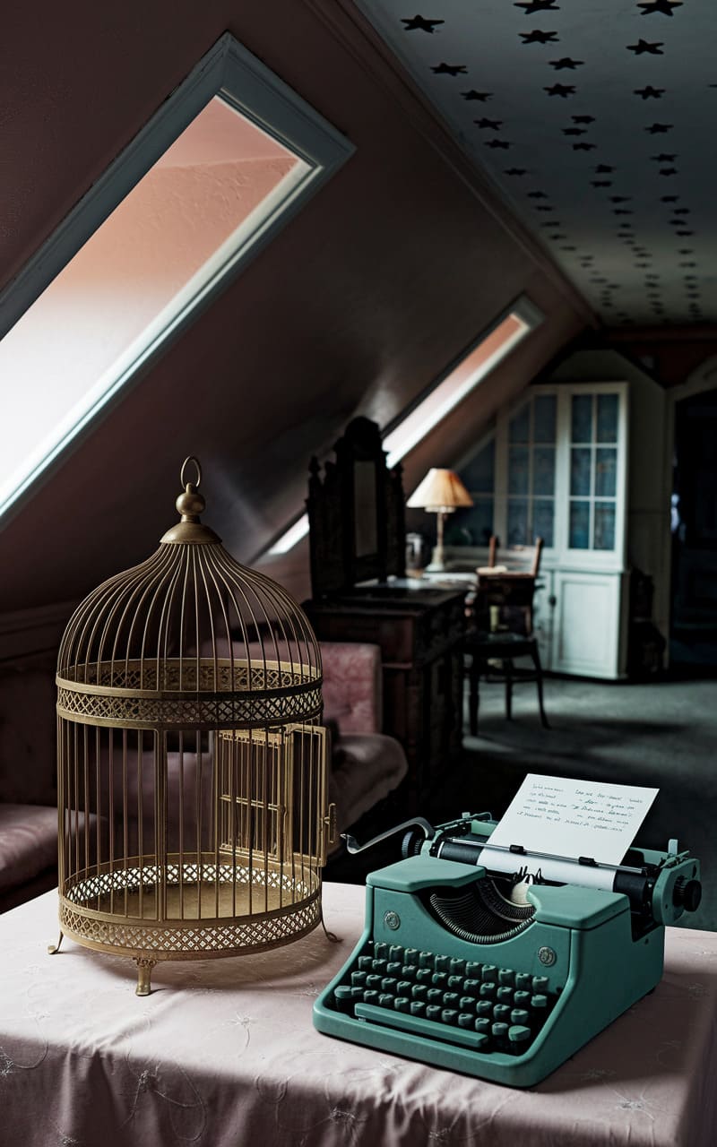 In the slanted attic room, a teal typewriter sits poised, a story waiting to be typed onto the blank page within, while a gilded birdcage stands empty, its door ajar, suggesting a silent escape. The room’s dusky palette, punctuated by the warm glow of a distant lamp, casts long shadows that dance across the star-scattered ceiling, blurring the lines between reality and a half-forgotten memory, a space where time seems to fold in on itself, leaving behind only whispers of untold narratives and the lingering scent of old paper and forgotten dreams.