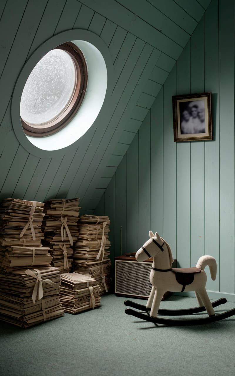 The attic room slants and curves, a hushed sanctuary painted in the muted teal of a fading memory. A porthole window, glazed with an ethereal frost, casts a soft, diffused light over stacks of neatly bound paper, each a whispered secret waiting to be unearthed. A solitary rocking horse stands sentinel, its plush form a silent promise of childhood dreams, while a framed photograph on the wall hints at a life lived beyond these slanted walls. The air is thick with unspoken stories and the quiet hum of forgotten time, a place where reality bends and imagination takes flight.