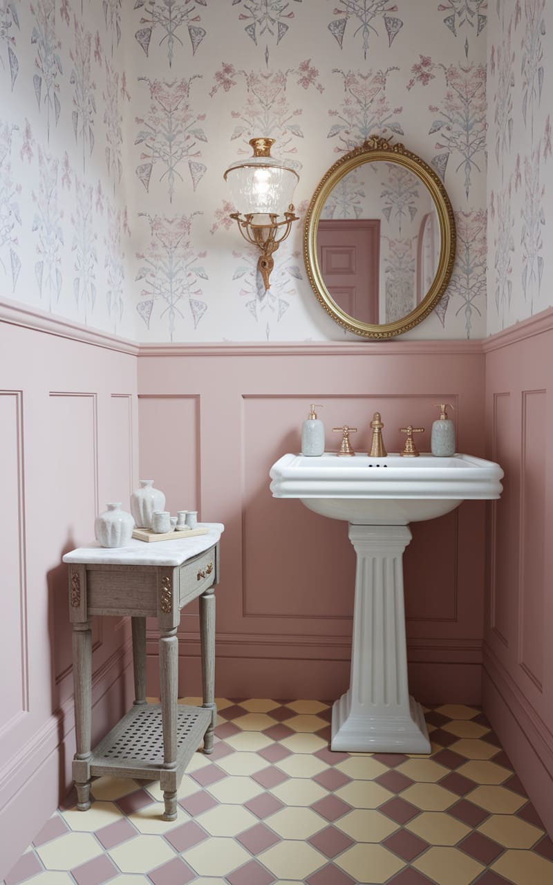 135. Soft Blush and Gold Dreamcore Powder Room with a Vintage Pedestal Sink
