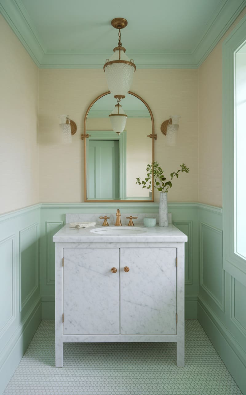 136. Pale Mint and Ivory Dreamcore Powder Room with Arched Mirror and Marble Accents