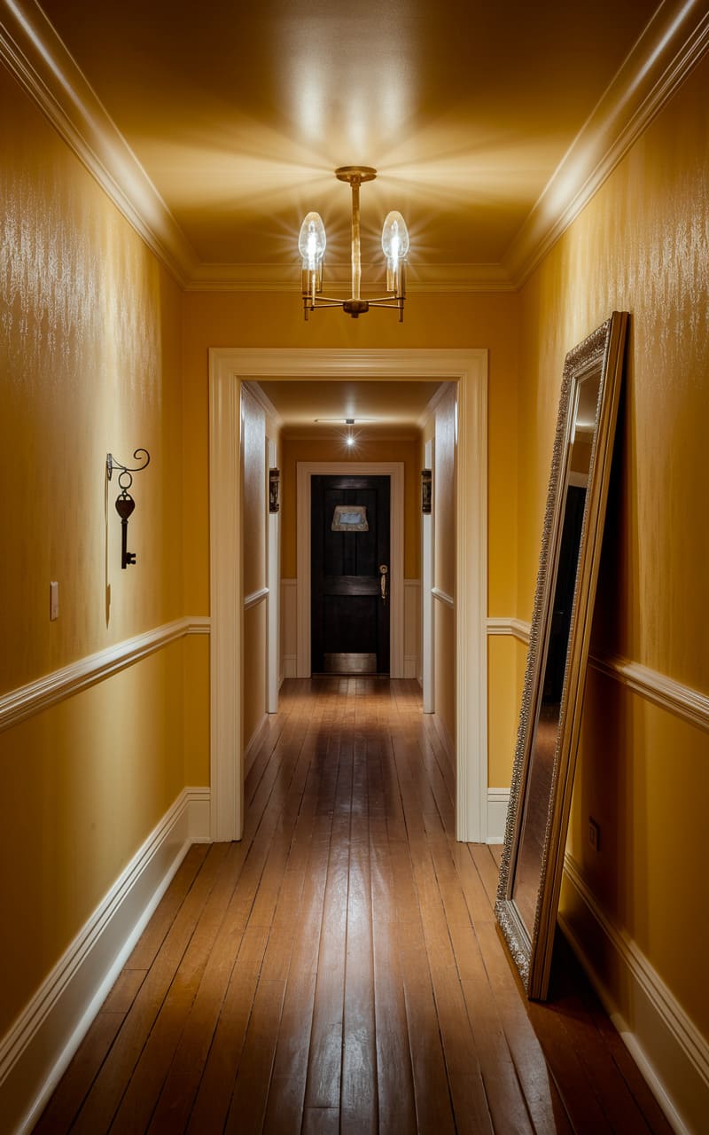 This hallway stretches like a golden fever dream, a tunnel of warm light and polished wood leading to a shadowed, beckoning doorway. A lone, oversized key hangs on the wall, a cryptic invitation, while a leaning mirror reflects not reality, but the unsettling possibility of another dimension just beyond its frame. It’s a liminal space, a silent corridor where the ordinary morphs into something strangely unsettling, a place where secrets linger in the shadows.
