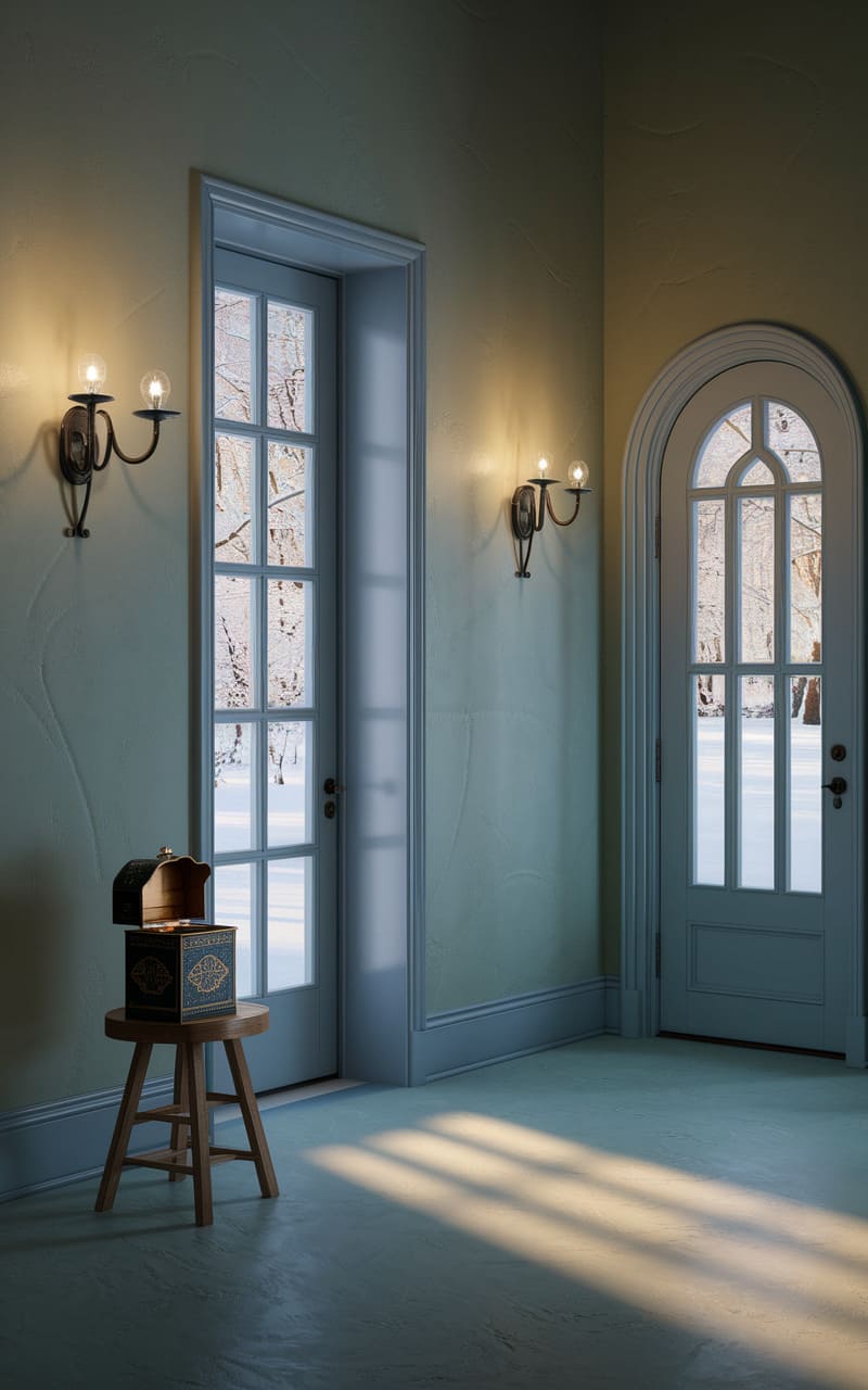 Twin doors, each a portal to a snow-dusted world beyond, stand like frozen breaths in a room bathed in the warm, yet eerie glow of flickering sconces. A lone wooden stool, bearing a mysterious, half-open box, sits in the path of a long, slanted shaft of light, a silent invitation to step into the liminal space between waking and dreaming, where the familiar becomes unsettlingly strange.