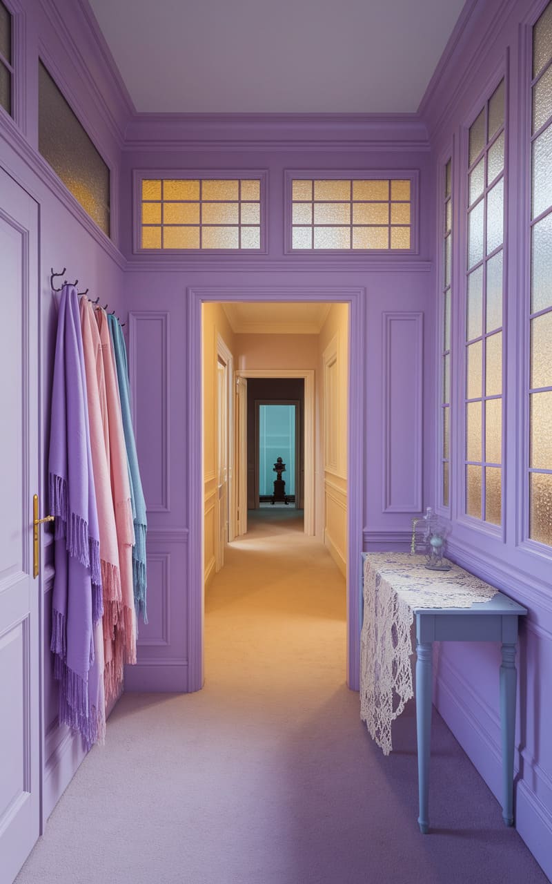 The hallway stretches, a lavender-tinted sigh, where the familiar geometry of doors and windows wavers at the edges, hinting at a reality just slightly off-kilter. Scarves hang like spectral afterimages, their soft hues echoing the walls, while a lace-draped table stands sentinel, a delicate anchor in a space that feels like a half-remembered dream. The distant doorway, a sliver of cool blue, promises an escape, or perhaps a deeper dive, into the liminal space between waking and sleep.