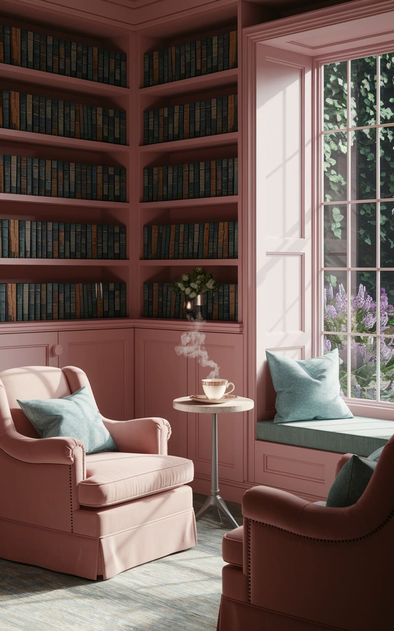 142. Blush Pink Dreamcore Library with a Cozy Reading Nook