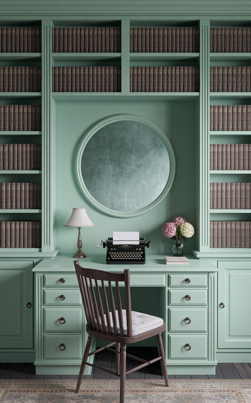 The room vibrates with the quiet hum of untold stories, its walls a soothing, muted green that seems to swallow time itself. A perfectly centered, slightly tarnished mirror reflects a reality just a touch off-kilter, while endless rows of identical, unreadable books line the shelves, a silent testament to forgotten knowledge. A vintage typewriter sits poised on the desk, a promise of narratives left unfinished, in a space where the familiar edges into the unsettlingly surreal.