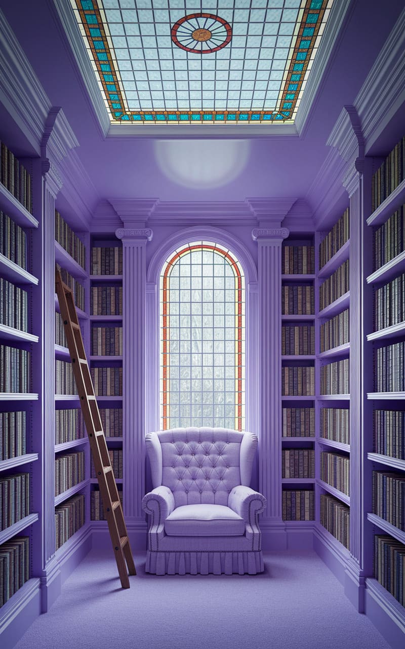The library hummed with a lavender hush, a monochromatic dreamscape where every surface, from the towering bookshelves to the tufted armchair, was bathed in a surreal, almost edible purple. A stained-glass skylight, a portal to a muted sky, cast a soft, ethereal glow, while a leaning ladder suggested a journey to forgotten stories, a silent invitation to lose oneself in the boundless sea of violet volumes. It was a space where the weight of words felt both comforting and disorienting, a place where time seemed to dissolve into the sheer, overwhelming intensity of color.