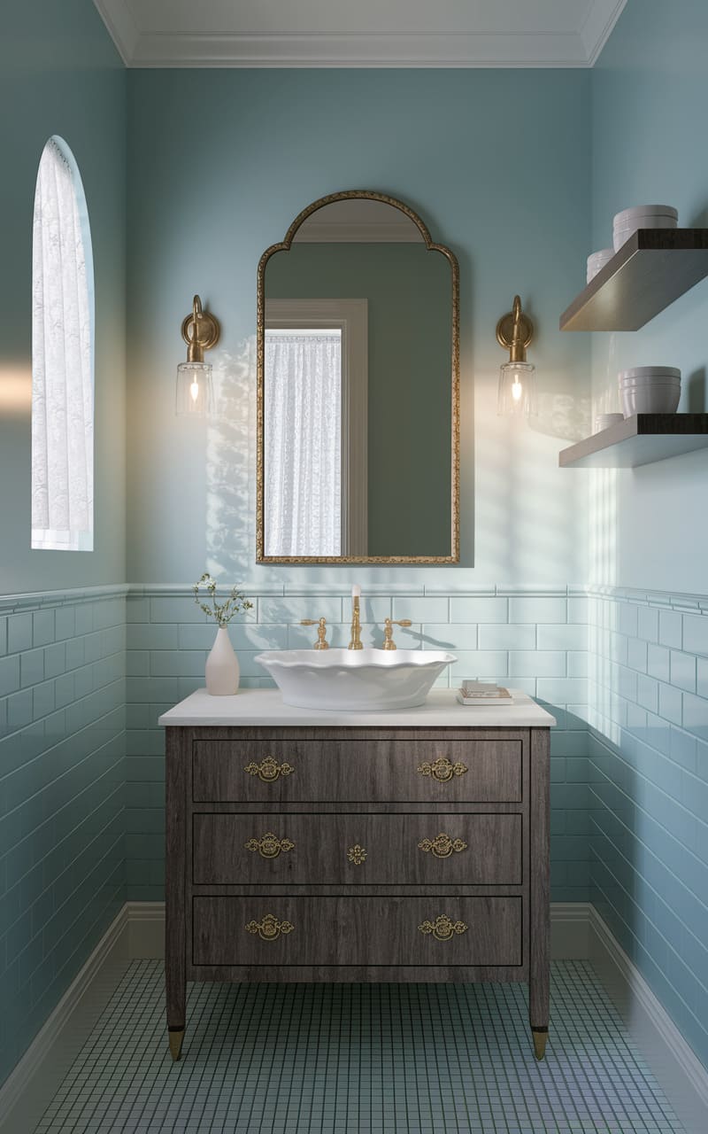146. Powder Blue and Soft Beige Dreamcore Powder Room with an Ornate Sink Basin