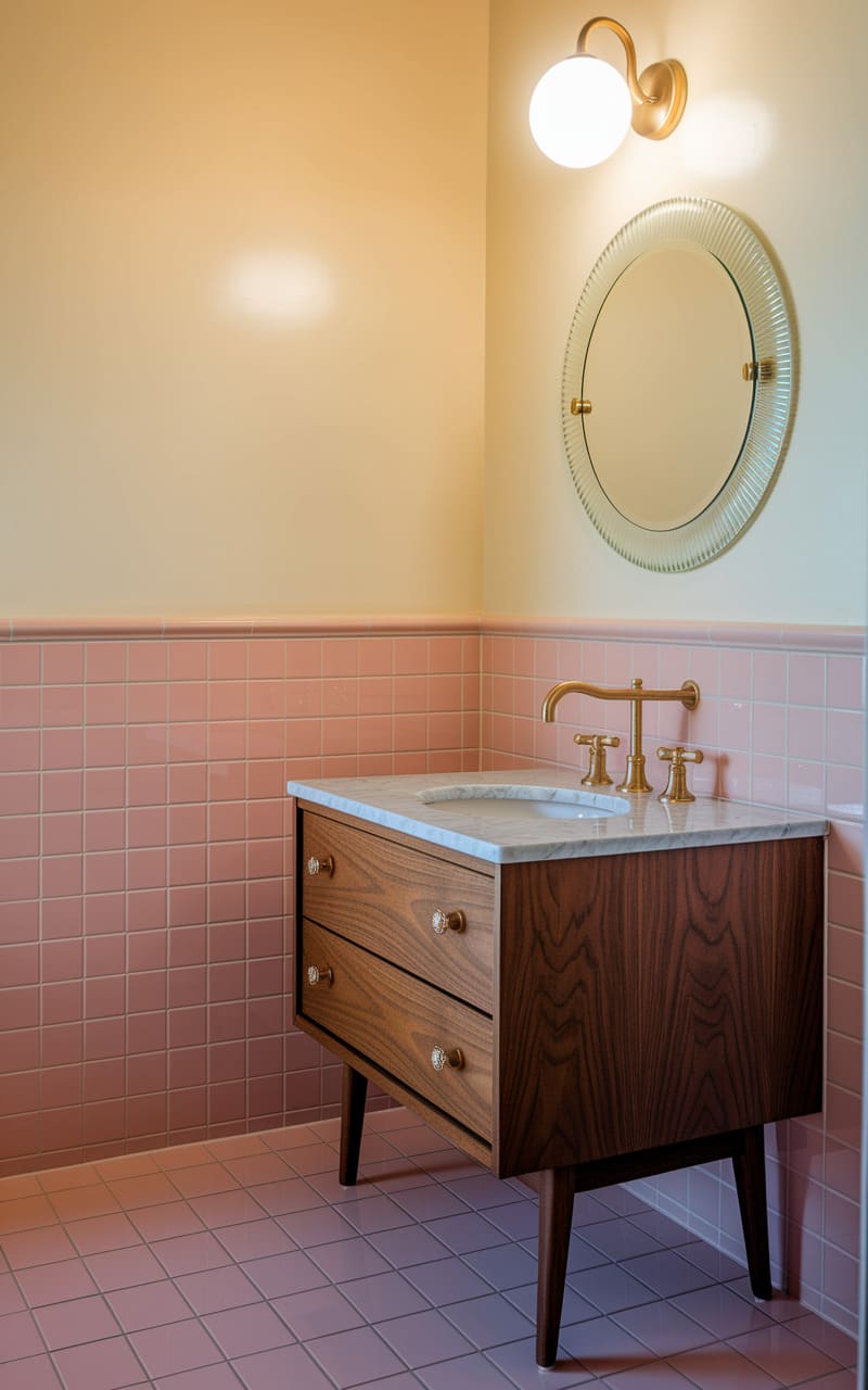In a bathroom bathed in a hazy, vintage glow, peachy tiles and a warm wooden vanity create a nostalgic tableau, where a fluted, circular mirror reflects a world softened at the edges, and the brassy glint of the faucet suggests a ritual of cleansing that transcends the mundane, hinting at a space where time slips sideways into a dream of quiet, pastel-toned serenity.