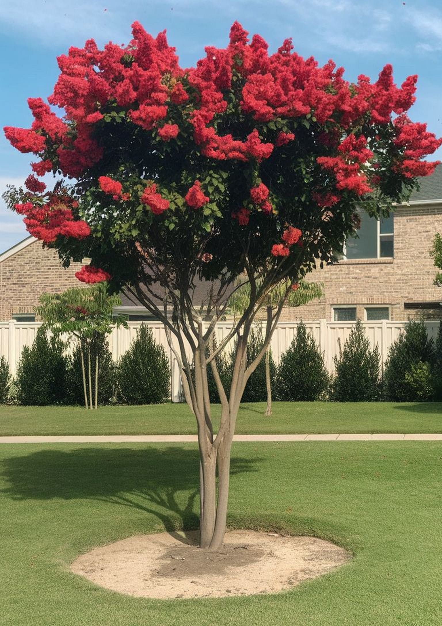 Flower colors range from shades of red and pink to white. Similar to other flowering trees, the crape myrtle doesn’t grow particularly large. It can reach around 20 to 30 feet while dwarf species will barely top 15 feet. The tree can be grown either as single-trunk or in multi-trunk fashion. While you can try shaping the growth of a young tree through pruning, it’s often much easier to just choose a good crape myrtle variety that naturally grows into a desirable shape. To take advantage of the drought resistance of the tree, it’s important to help the tree establish itself properly for a few growing seasons.