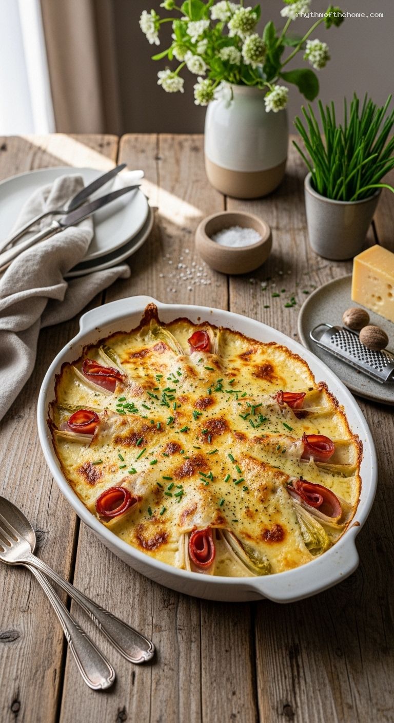 Braise the endives and make the béchamel up to 2 days ahead; store separately, covered, in the refrigerator. Assemble just before baking, or assemble and refrigerate up to 24 hours (add 5–10 minutes to bake time if cold). Leftovers keep 3 days in the fridge; reheat, covered, at 350°F (175°C) for 15–20 minutes until hot. Freezing is not recommended (cream sauces can separate).
