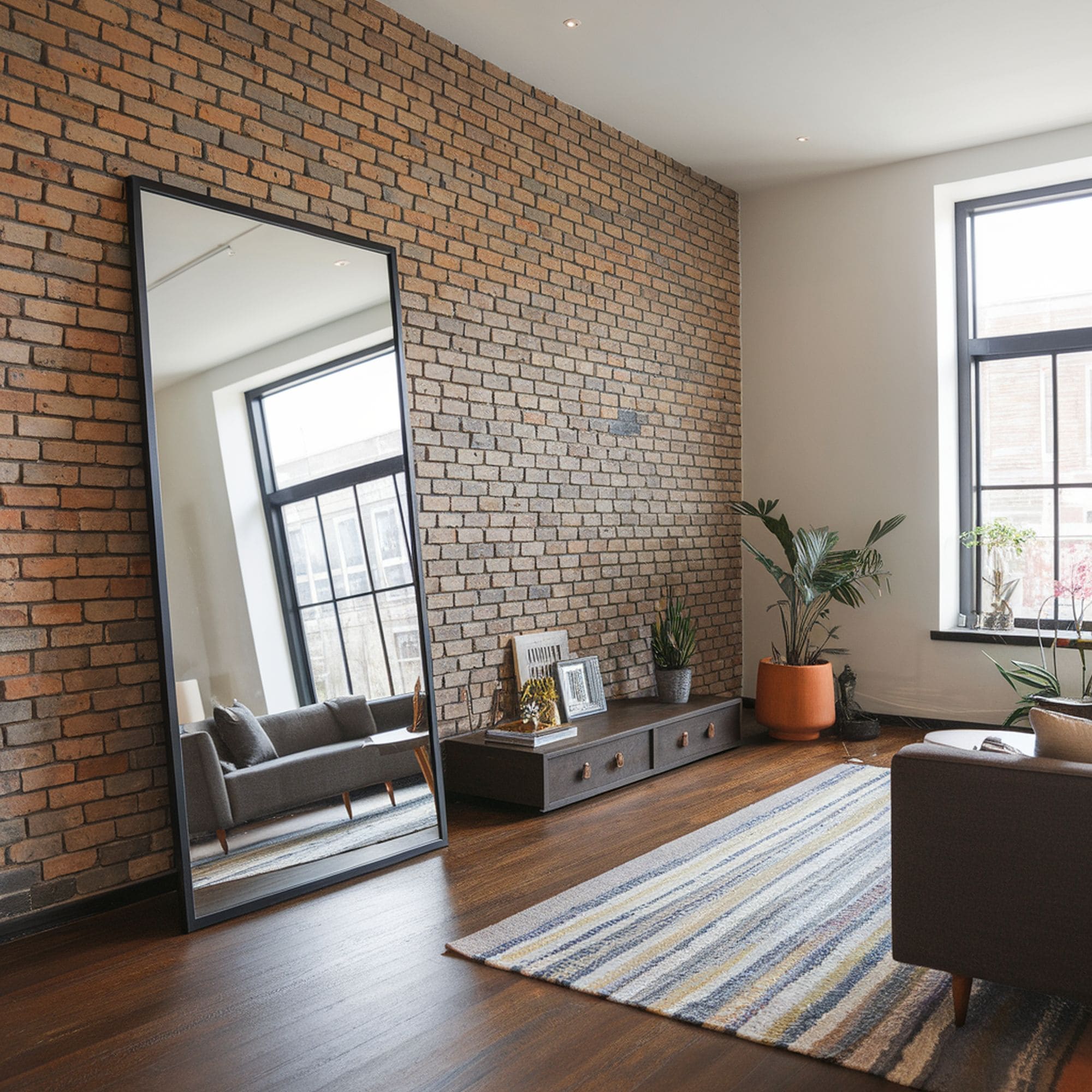 The size of the accent pieces matters when you’re decorating an exposed brick wall. By leaning large elements like an oversized mirror against the wall, it can result in an interesting visual effect. Here’s a stylish floor mirror found on Amazon that would work well. Try the same thing with large picture frames. For extra depth you could position some small cabinets or other similar furniture pieces against the larger accents.