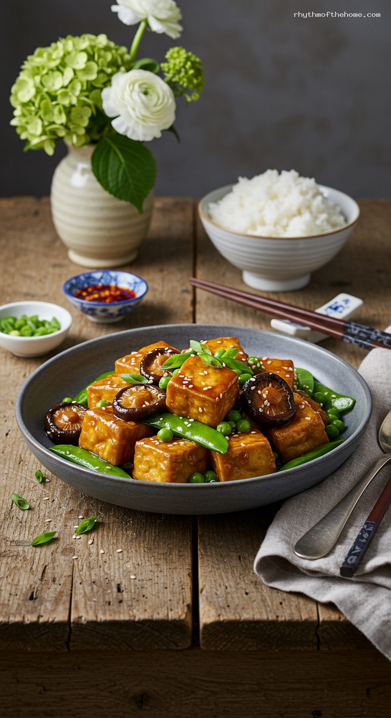Return the crispy tofu to the pan, turning gently to coat. Reduce to a gentle simmer and cook uncovered 5 to 7 minutes, allowing the tofu to absorb the sauce. Add the frozen peas and simmer 1 minute more.