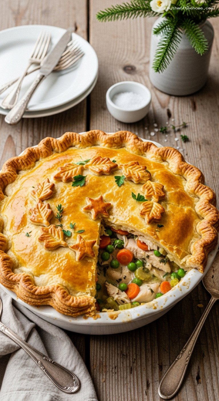 - Creamy, cozy filling packed with tender chicken and colorful vegetables, perfect for holiday gatherings.