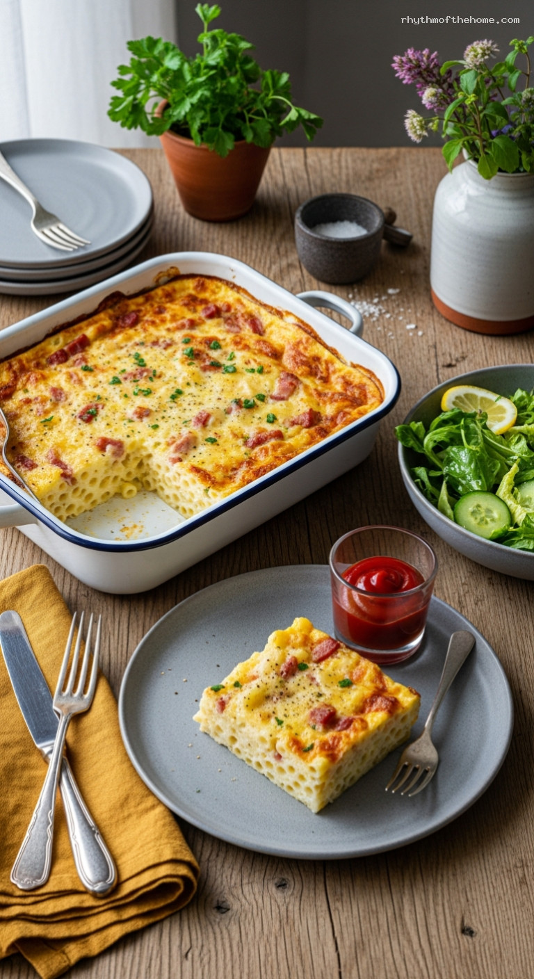 Let the makaronipudding rest for 10 minutes to finish setting. Cut into neat squares. Serve warm with ketchup on the side and a crisp green salad tossed with olive oil, lemon juice, salt, and pepper.