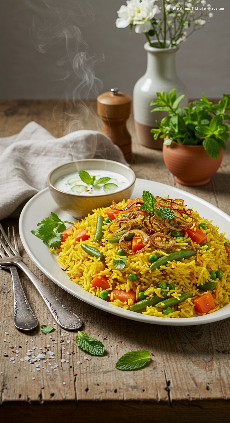 - 7. Rest 10 minutes; fluff gently. Mix raita ingredients and serve alongside.