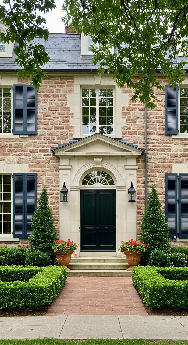This handsome French home showcases a strong Georgian influence, with its use of rich red brick and its balanced, symmetrical design. The facade is orderly and elegant, with dark navy-blue shutters providing a classic, striking contrast to the brick. A beautiful arched entryway, crafted from light-colored stone with a fanlight window, serves as a formal and welcoming focal point. The landscaping is pristine and traditional, with a brick walkway, manicured boxwood hedges, and two conical evergreens in terracotta pots flanking the entrance, creating a picture of timeless, established grace.