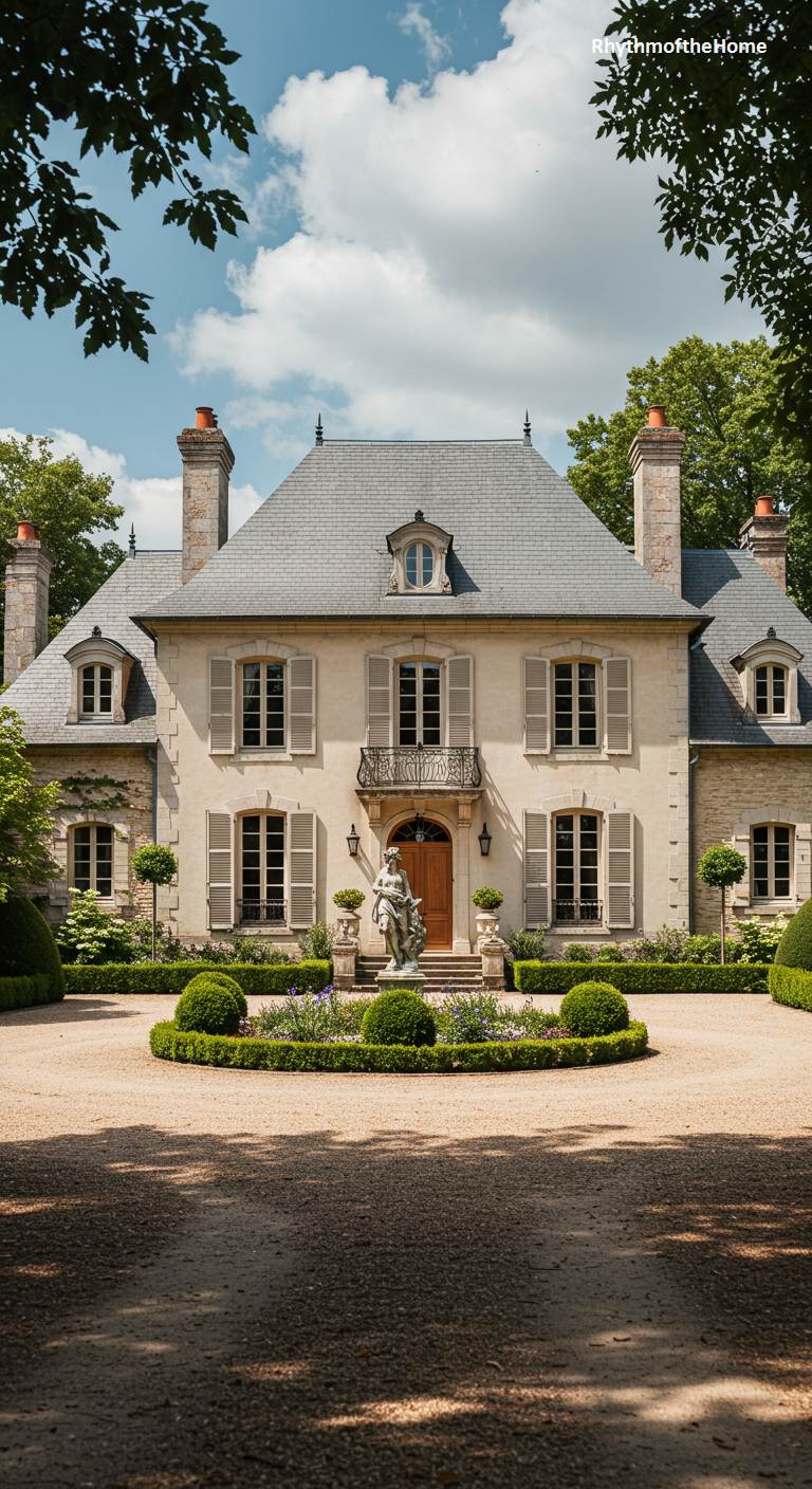 This impressive French home exudes a quiet, understated grandeur through its perfect symmetry and harmonious proportions. The light-colored stucco and stone facade is accented by muted grey shutters and a classic slate roof featuring a central oval window. A delicate wrought-iron balcony above the main entrance adds a focal point of elegance. The landscaping is meticulously planned, with a central circular garden bed featuring a classical statue, surrounded by perfectly spherical boxwood shrubs. The sweeping gravel driveway and dappled sunlight filtering through mature trees create a serene and distinguished atmosphere of timeless sophistication.