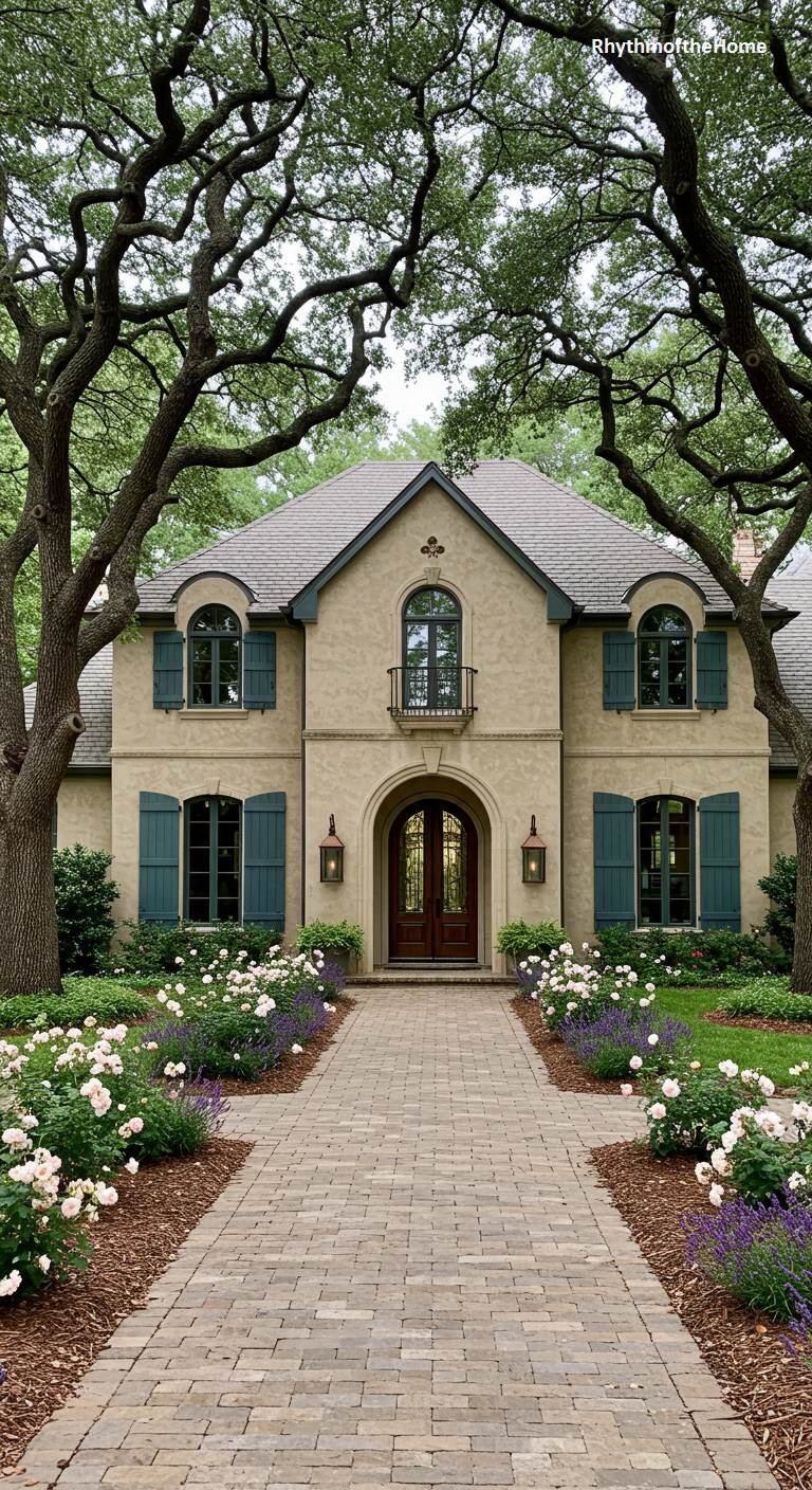 Nestled under the protective canopy of magnificent, gnarled oak trees, this French home presents a vision of enchanting romance. A gracefully paved stone walkway, bordered by lush white roses and lavender, leads to a prominent arched entryway with a beautiful wooden door. The home’s soft, earthy stucco finish is complemented by deep teal shutters, creating a subtle yet striking color palette. Two arched windows on the upper floor echo the shape of the entrance, lending a harmonious and welcoming symmetry to the entire facade. This is a residence where architecture and nature are in perfect, elegant conversation.