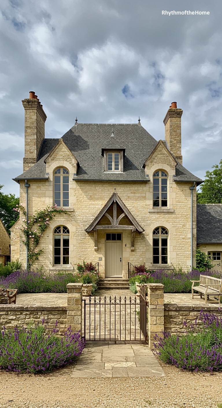 While reminiscent of the English Cotswolds, this stone French home possesses a unique Gallic charm. Constructed from warm, honey-colored limestone, its facade features elegant arched windows on the upper floor and a welcoming, timber-framed porch over the front door. A simple iron gate set into a low stone wall provides entry to a tidy gravel path, flanked by vibrant purple lavender bushes. Climbing roses begin their ascent up the stone walls, promising even more beauty with time. The cloudy sky overhead adds a touch of drama to this otherwise tranquil and utterly charming country scene.