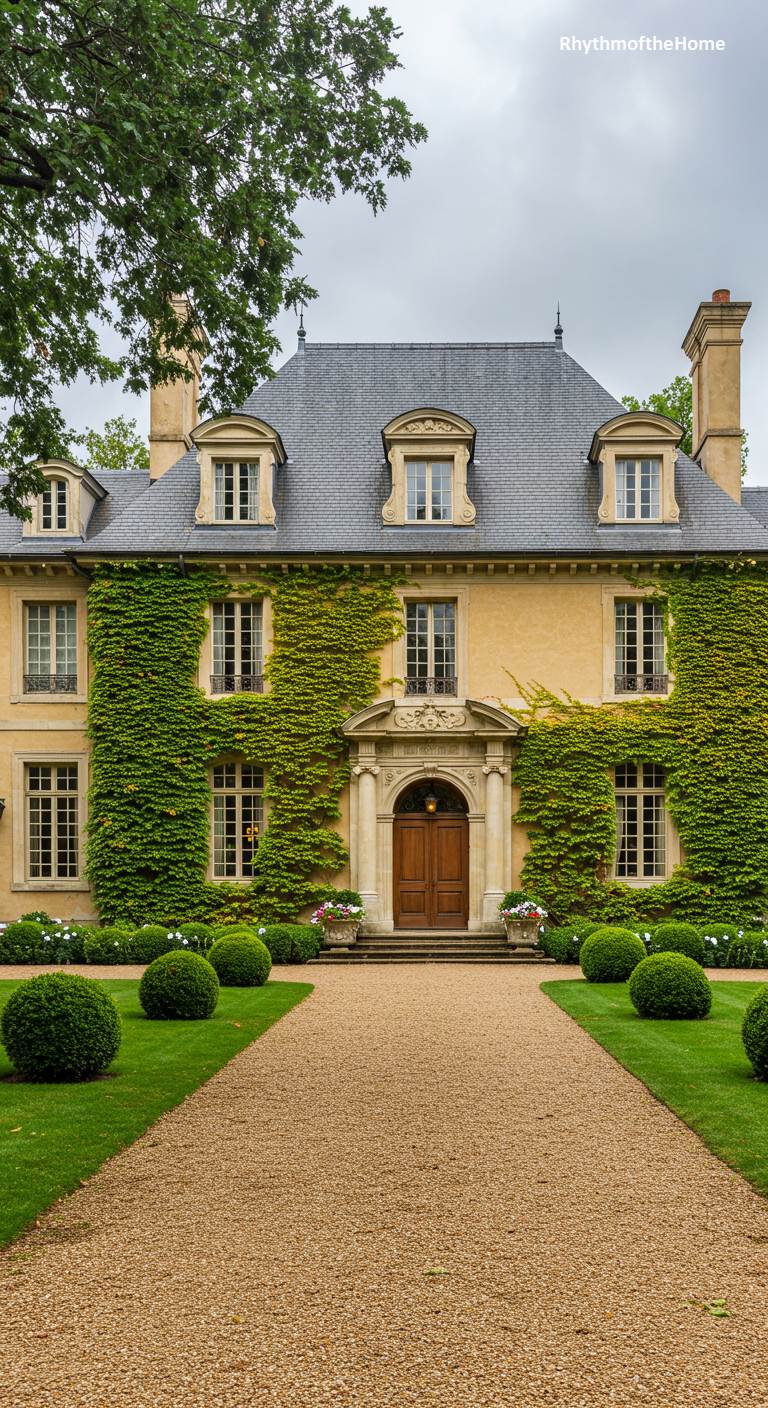 This grand French home wears its history like a verdant cloak. Thick, beautifully maintained ivy climbs the walls in two symmetrical panels, framing the central entrance and leaving the warm, yellow-toned stucco exposed in the middle. The formal architecture, with its tall windows, classic dormers, and ornate stone doorway surround, suggests a distinguished past. A wide gravel driveway leads directly to the entrance, bordered by a perfectly manicured lawn and spherical boxwood hedges. The combination of rigid formality in the landscaping and the wild nature of the ivy creates a captivating and balanced composition.