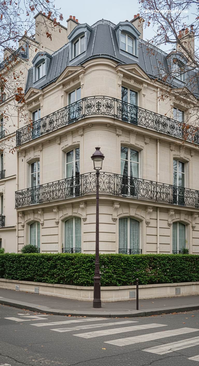 This elegant French home embodies the quintessential Haussmannian architecture of Paris. Occupying a prominent street corner, its cream-colored cut-stone facade curves gracefully, adorned with ornate black wrought-iron balconies on the second and third floors. Tall French windows with delicate white curtains hint at sophisticated interiors. A slate mansard roof, complete with dormer windows, crowns the building, a classic feature of the city’s skyline. A traditional Parisian lamppost stands sentinel on the sidewalk, overlooking the crosswalk and a neatly trimmed hedge, grounding this picture of urban chic in everyday life.