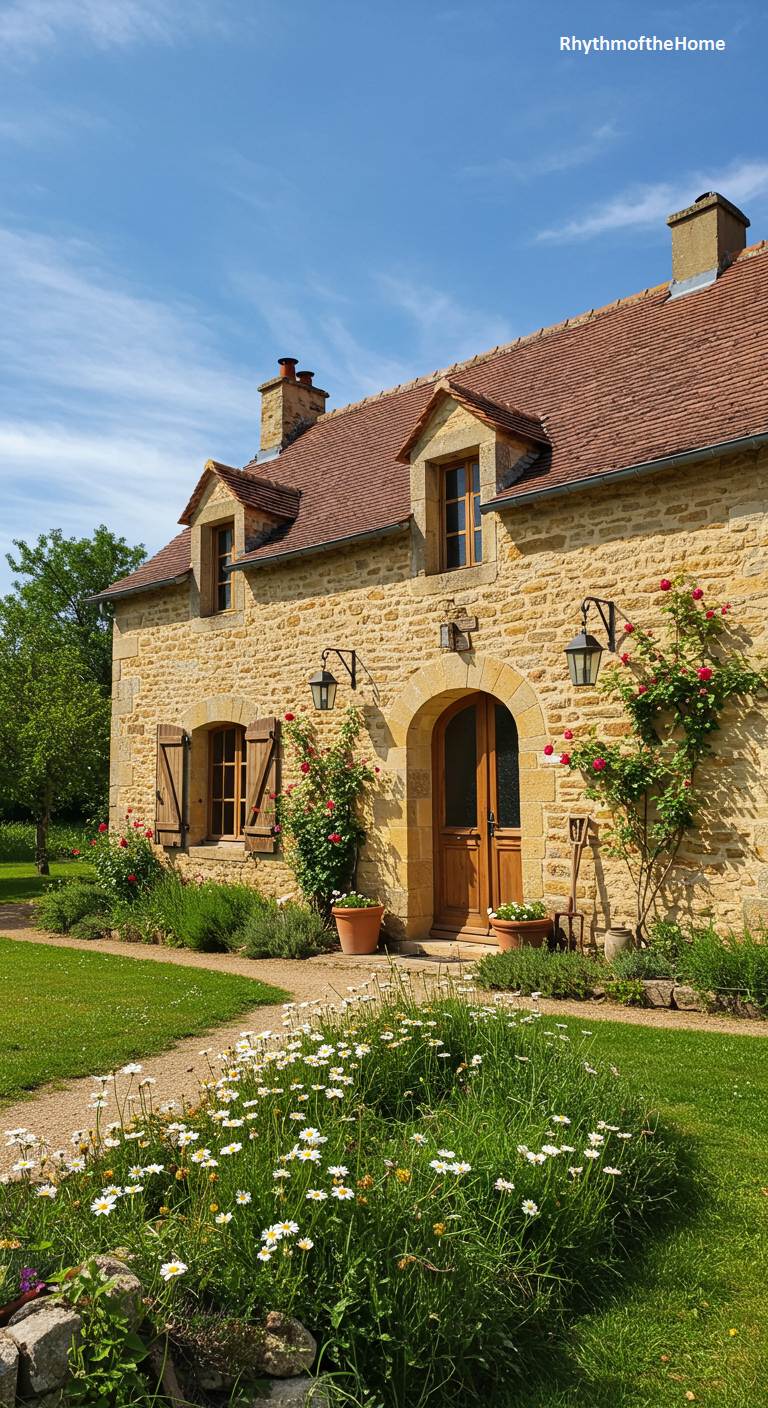 Basking in the warm glow of a sunny afternoon, this lovely stone French home is the picture of country tranquility. Its golden stone walls are adorned with climbing red roses that flank the arched wooden doorway, adding a splash of vibrant color. Simple wooden shutters and hanging lanterns contribute to its rustic, welcoming appeal. In the foreground, a patch of cheerful white daisies grows wild in the lush green lawn, enhancing the feeling of natural, unpretentious beauty. A simple gravel path curves gently towards the entrance, inviting you into this peaceful rural retreat.