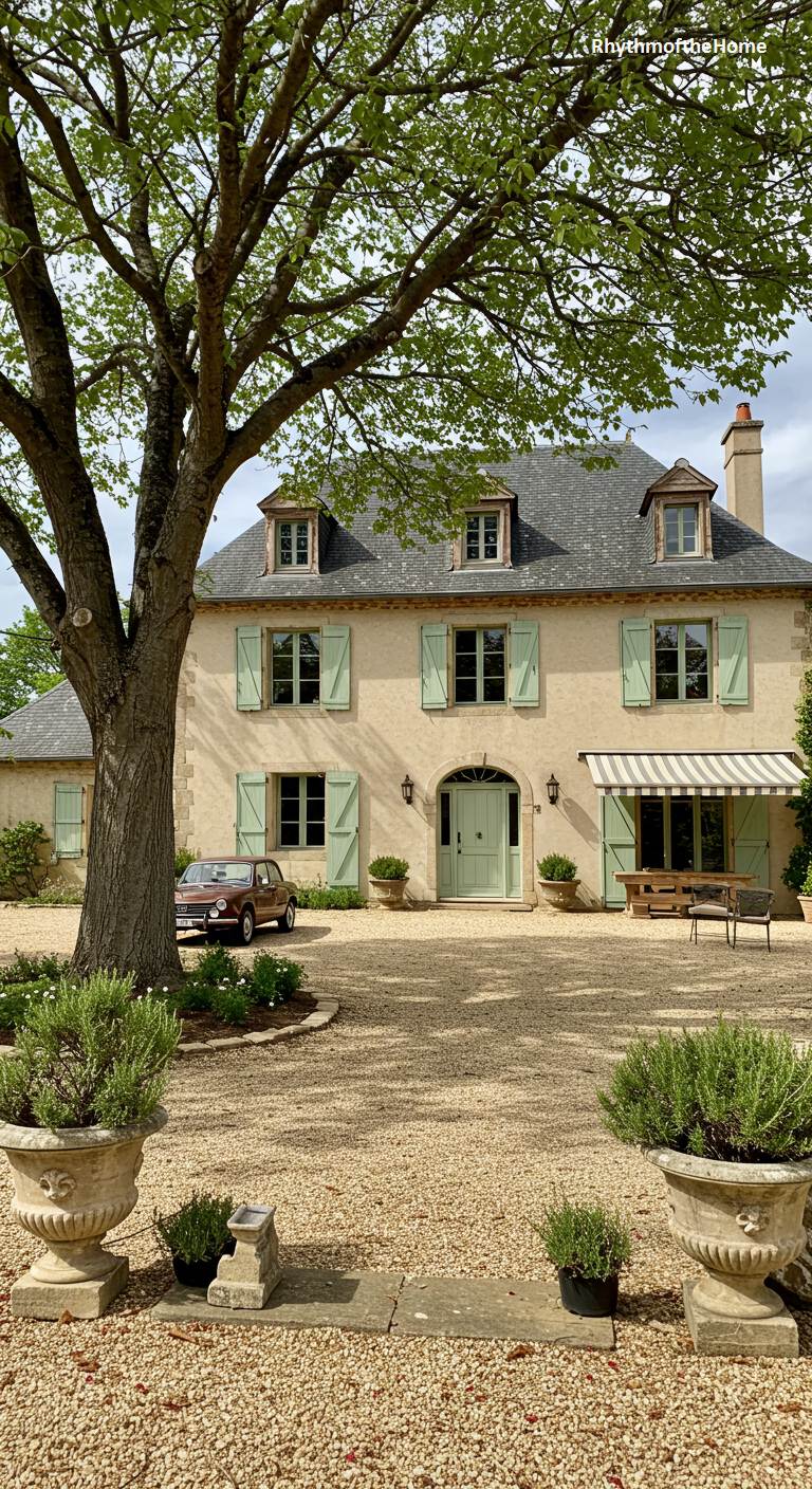 This sprawling French home offers a refreshing and relaxed take on classic style. The main house is finished in a soft stucco, complemented by charming mint-green shutters and a matching front door. A vintage red car parked in the gravel courtyard adds a playful and nostalgic touch of color. A large, leafy tree provides ample shade, its dappled light dancing across the facade and grounds. In the foreground, two large stone planters filled with rosemary hint at the fragrant gardens beyond. An attached awning suggests a casual outdoor seating area, perfect for enjoying the peaceful surroundings.